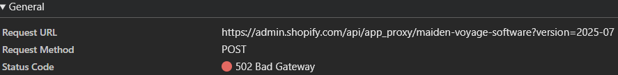 Yesterday we updated the Shopify CLI and did an app release (said we had to release to the new next-gen platform by updating the CLI). Now we’re seeing 502 gateway errors when trying to make GraphQL queries using direct admin api access (shopify:admin/api/2025-07/graphql.json). We’re making these calls in an AppBridge app inside the Shopify admin.
