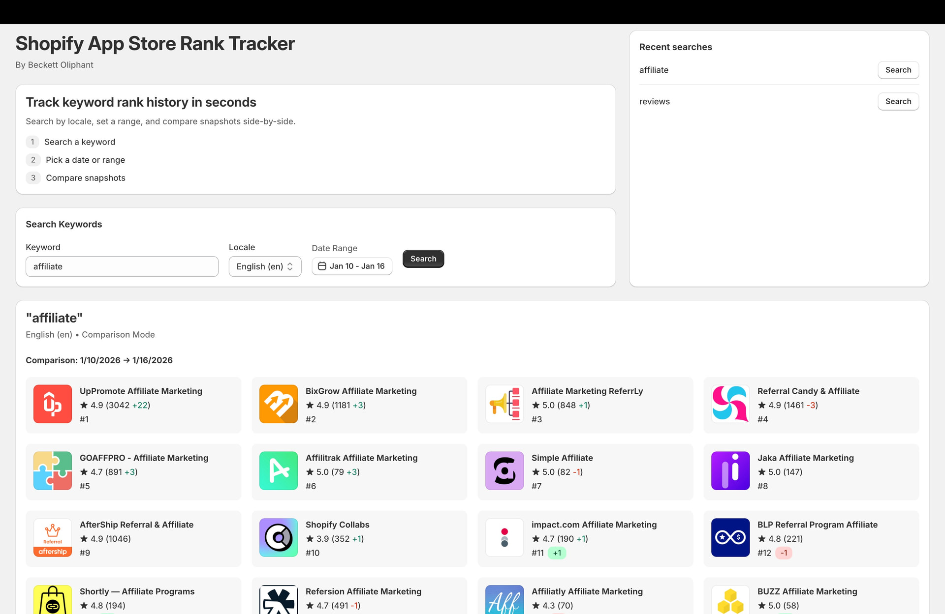 I made this tool that tracks keyword results pages over time so you can use it to see what the results were at different points in time plus how many reviews whichever app got within a time range and how many positions they gained. It’s ready to be made public but before I release it, I wanted to ask if any Shopifolk had any objections or if there are any rules against this that I could be missing. I made sure it’s very gentle with scraping! It will also be free.