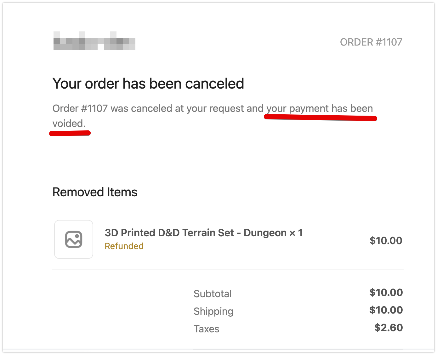 And here’s the default Order Cancellation email I received, indicating the payment was voided and refunded.
