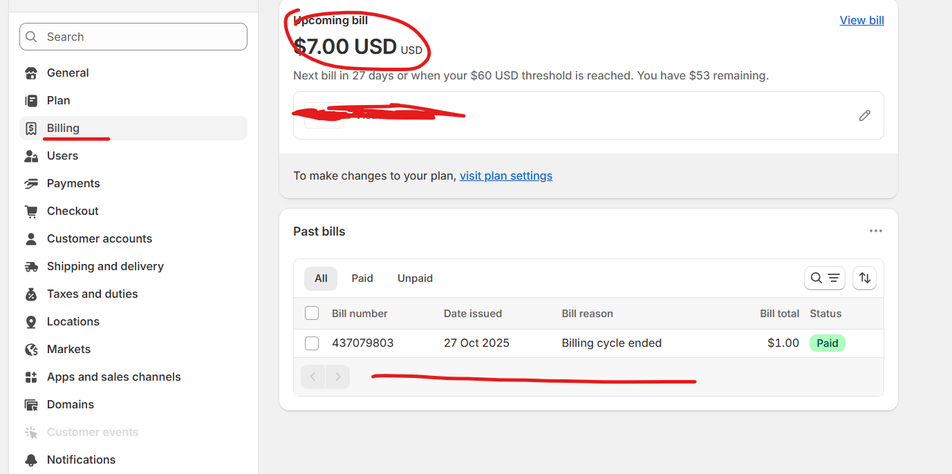 but as u can see below it is not added in shopify bill due to which it wont be deducted after the cycle