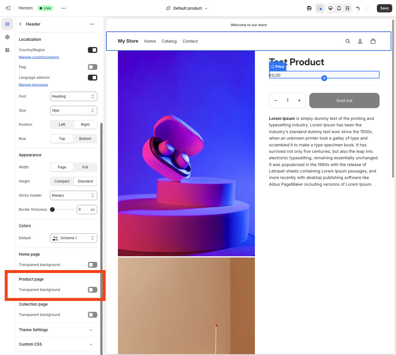When “Transparent background” is enabled for the Header on product pages, the product images shift to the very top of the page and overlap the announcement bar.
