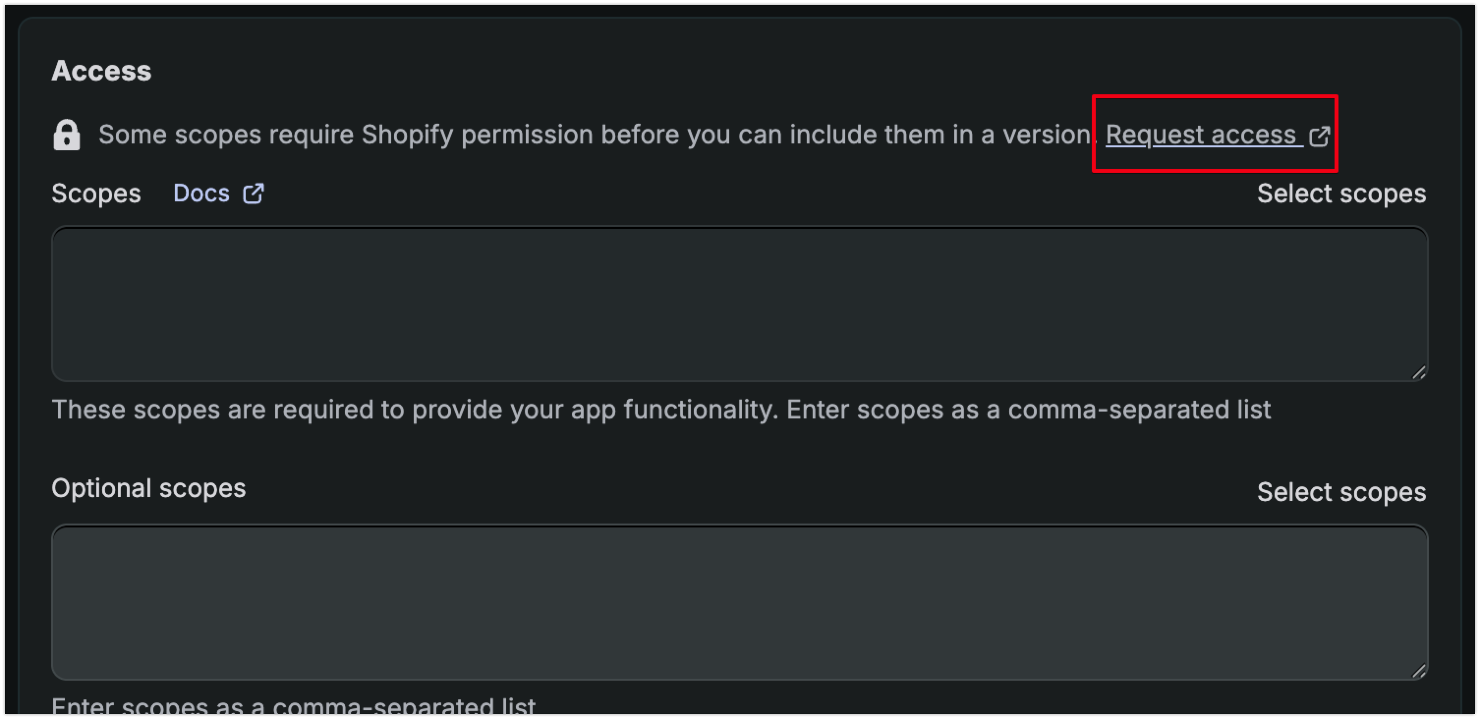 You do however need to first request access for this scope via your Partner Dashboard. If you don’t request the access first, then you won’t be able to declare the scope in the Dev Dashboard UI.