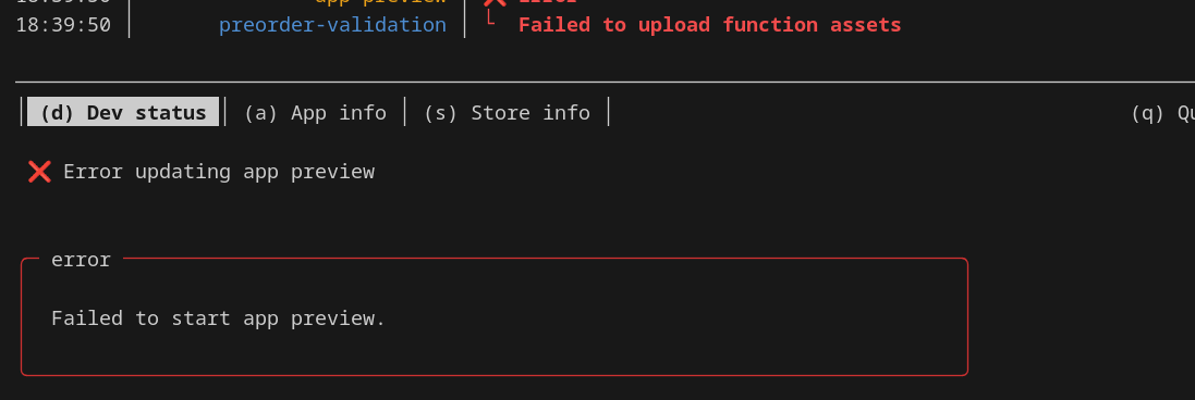 The deploy now completes for everything except two of our Shopify Function extensions (show-payment-after-calendar-loaded and rate-controller). Both have shopify.extension.toml files pointing to dist/function.wasm, and the generated function.wasm files are present. We have not touched these functions since the last successful deploy.