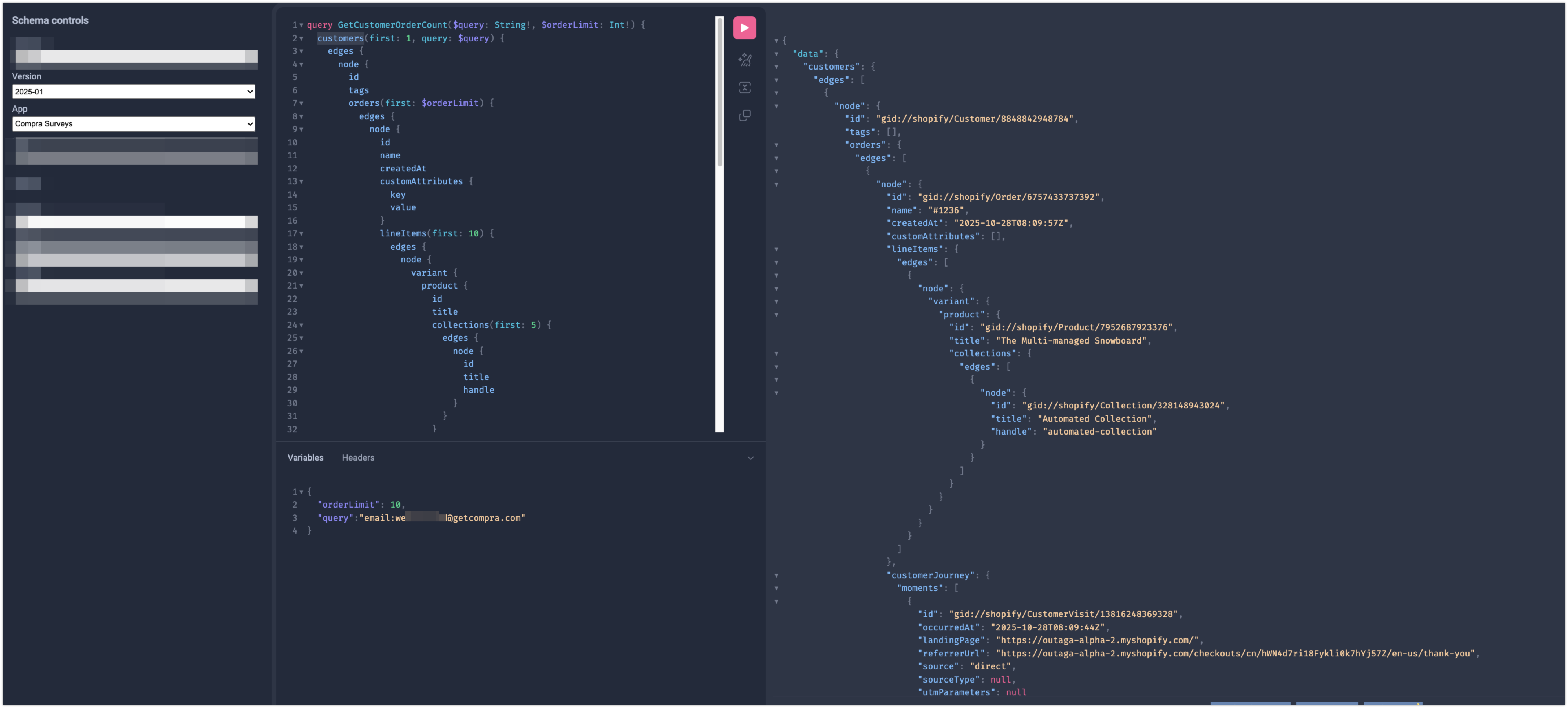 Our backend, in turn, performs a GraphQL network call to Shopify to retrieve customer and order parameters as mentioned above.